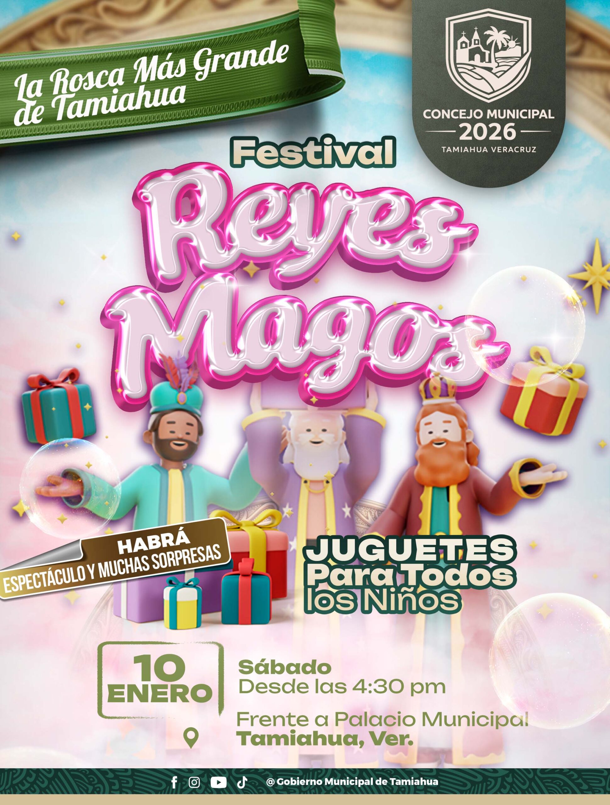 Con el firme objetivo de fomentar la unión familiar y preservar las tradiciones que llenan de alegría a nuestra comunidad, el Concejo Municipal 2026 de Tamiahua invita cordialmente a toda la población a asistir al gran Festival de Reyes Magos.