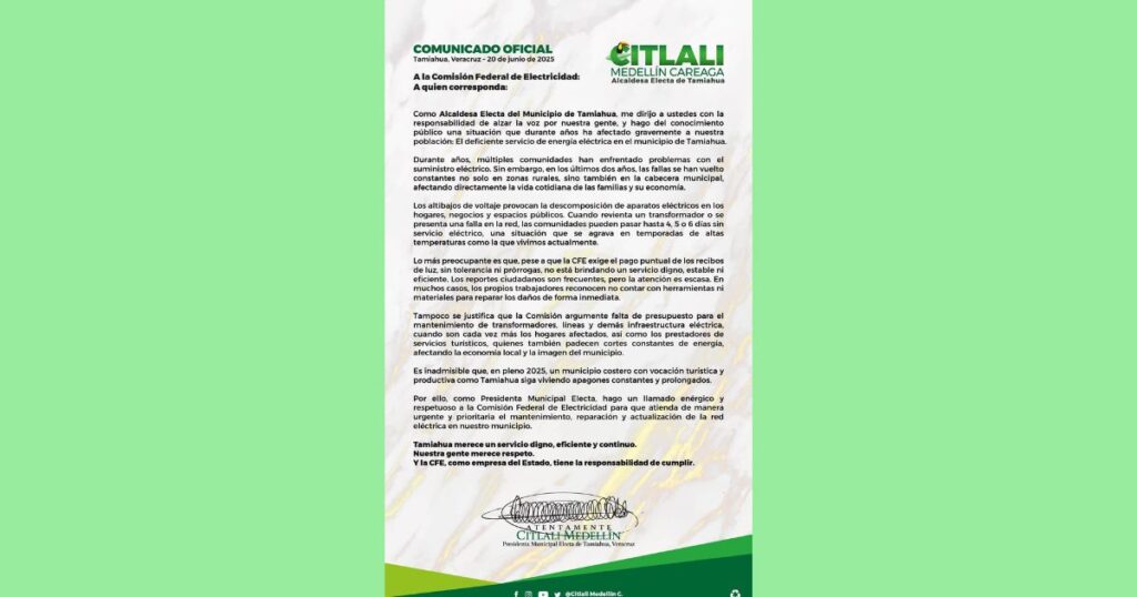 la Presidenta Municipal Electa de Tamiahua, Citlali Medellín Careaga, alzó la voz por los habitantes del municipio ante los constantes y prolongados apagones.