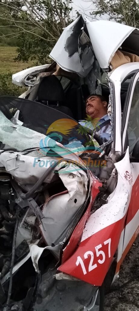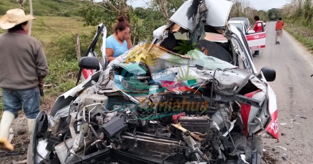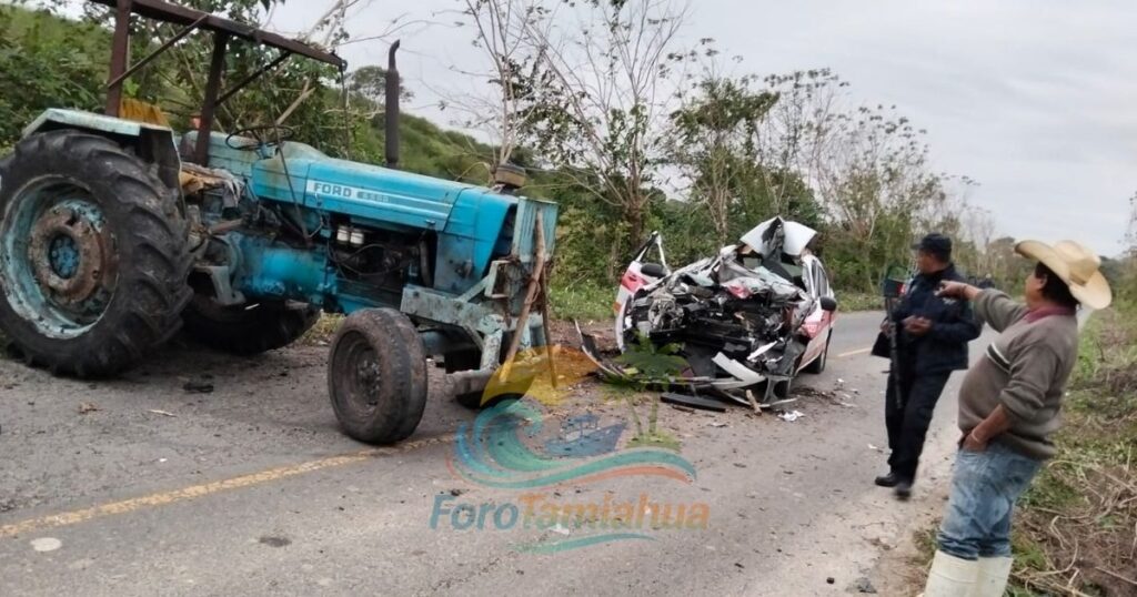 Tamiahua, Ver.— Un terrible accidente se registró sobre la carretera Tuxpan-Tamiahua, en el tramo que comprende entre la entrada a San Marcos – Mahahual, donde el taxi número 1257 de la ciudad de Tuxpan impactó de frente contra un tractor, dejando la unidad de alquiler prácticamente destrozada.