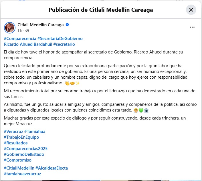 La presidenta municipal electa de Tamiahua, Citlali Medellín Careaga, publicó un mensaje en redes sociales donde reconoció el trabajo del secretario de Gobierno de Veracruz, Ricardo Ahued Bardahuil, tras su comparecencia de este martes.