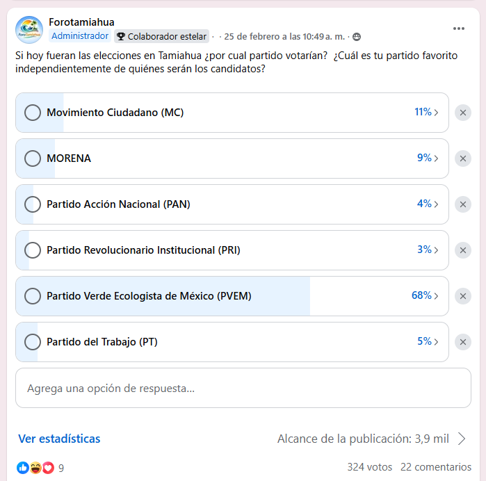 La encuesta realizada el 25 de febrero por ForoTamiahua en el grupo Chisme Tamiahua registró 324 votos y un alcance de casi cuatro mil personas.
