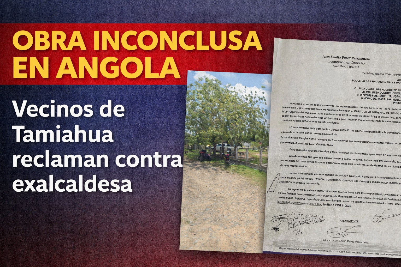 Tamiahua, Veracruz.– Habitantes de la colonia Angola solicitaron formalmente que el actual Concejo Municipal les considere dentro del listado de afectados por obras inconclusas realizadas durante la administración encabezada por la exalcaldesa Linda Guadalupe Rodríguez Torres.